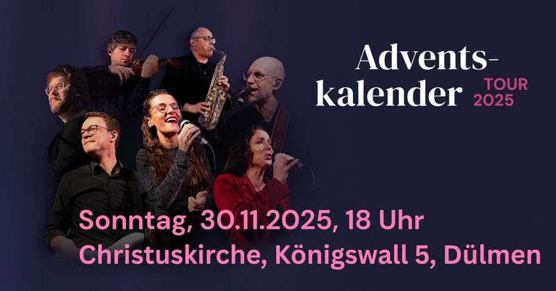 Seit vielen Jahren ist die Adventskalender-Band rund um den Produzenten und Bassisten Jan Primke in der Vorweihnachtszeit in ganz Deutschland unterwegs. Sie füllen Kirchen und andere Säle mit Musik und Vorfreude auf das Fest der Feste. Mit modernen Popsongs und vertrauten Weihnachtsliedern gestalten die Musiker stimmungsvolle Abende, die Raum schaffen für Begegnung, Besinnung und Genuss.