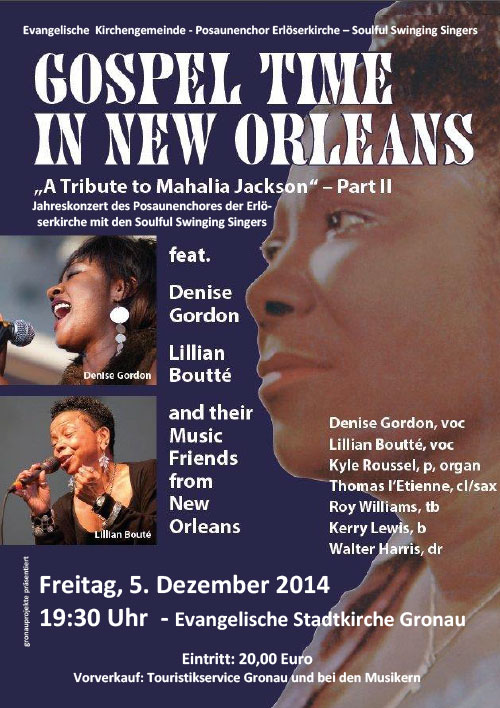 Eine Premiere erwartet Gospel- und Jazzfreunde am Freitag, 5. Dezember, in der Gronauer Stadtkirche. Der Evangelische Posaunenchor der Erlöserkirche und die „Soulful Swinging Singers“, eine Gospelformation aus Gronau, präsentieren das Konzert „Gospeltime in New Orleans – A Tribute to Mahalia Jackson“. Mit von der Partie sind die US-amerikanische Jazz- und Soulsängerinnen Denise Gordon und Lillian Boutté aus New Orleans. Damit vereint das Gemeinschaftskonzert erstmals Gospel- und Bigband-Sounds mit ebenso stimmgewaltigen Sängerinnen aus den USA.