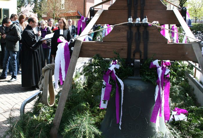 „Fürchtet Gott“, „Habt die Brüder lieb“ und „Tut Ehre jedermann“ mahnen die Inschriften auf den drei Glocken. Pfarrer Marcus Tyburski deutet sie als Aufforderungen zu Gottesliebe, Ökumene und Toleranz. Bei aller Freude dürfe der Dank für die alte Glocke nicht vergessen werden, meint der Pfarrer: „In 100 Jahren des Bestehens unserer Kirche hat sie ihren guten Dienst getan.“ Die alte Stahlglocke wird im Tausch gegen die Glocken der Erlöserkirche demontiert. Sie soll einen Ehrenplatz auf dem Gelände des Diakonischen Werkes erhalten.