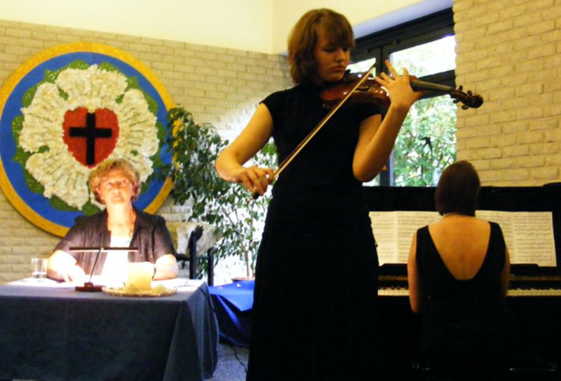 Gleich nach der Begrüßung von Pfarrer Thomas Ring versetzte Schlegel mit „Dichters Herz“ von Edward Grieg die Zuhörer in die passende Stimmung zum Einstieg in Henrichmanns Gedichte. „Laufen über Worte, nichts als Worte... Ich laufe über Himmelssilben“, las die Autorin als erstes. Zauberhafte, bunte Bilder ließ sie mit „Landschaften mit gelben Vögeln“, „Winteraustreiben“, „Engel“ und „Heimkehr“ entstehen.