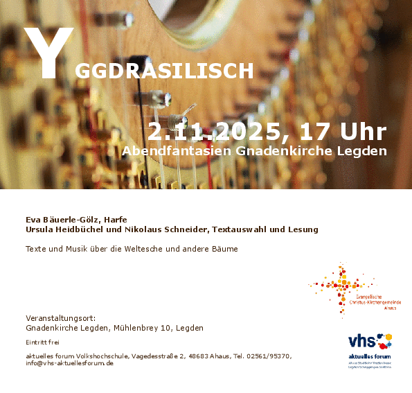Abendfantasie: Die Reihe der Abendfantasien ist beim Buchstaben Y angekommen und steht am 2. November unter dem seltsamen Titel "Yggdrasilisch". Yggdrasil ist in der nordischen Mythologie der Weltenbaum. Eine riesige Esche, die die kosmische Ordnung und die Verbundenheit aller Dinge symbolisiert. Als Musikerin erwarten wir Eva Bäuerle-Gölz an der Harfe, für Textauswahl und Lesung sind in bewährter Weise Ursula Heidbüchel und Nikolaus Schneider verwantwortlich. Texte und Musik handeln über die Weltesche und andere Bäume. Beginn ist um 17 Uhr in der Gnadenkirche Legden. Der Eintritt ist frei, um eine Spende wird gebeten.
