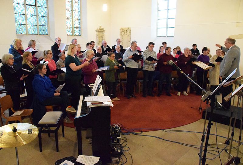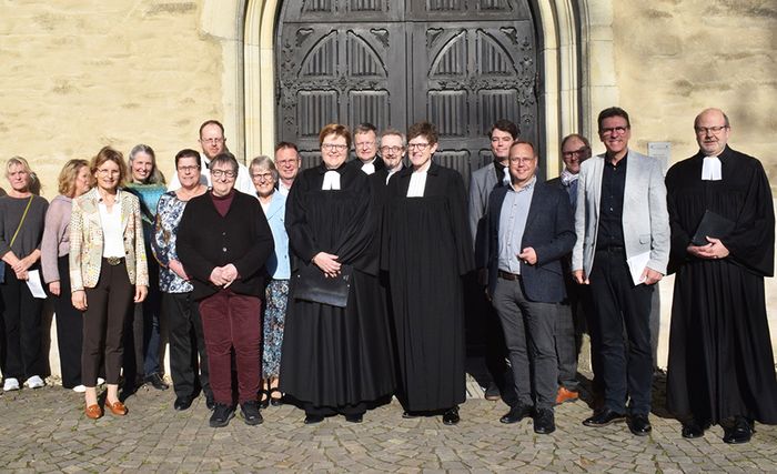 Schließlich endete der Gottesdienst mit der Entpflichtung der Superintendentin. „Mit deiner Berufung zur Theologischen Vizepräsidentin der Evangelischen Kirche von Westfalen übernimmst du neue Aufgaben“, sagte die Oberkirchenrätin, „dafür geben wir dich frei von den dienstlichen Verpflichtungen in diesem Kirchenkreis.“ Göckenjan-Wessel und zahlreiche Votanden legten Falcke die Hände auf und spendeten Segen. Ihre Wertschätzung drückten in Grußworten die Superintendenten-Kollegen Holger Erdmann und André Ost sowie Kreisdechant Jörg Hagemann aus. Für musikalische Untermalung sorgten ein von Kantorin Simone Schnaars zusammengestellter Projektchor und die Gemeindeband. Schnaars spielte überdies die Orgel. Harmonisch klang die Verabschiedung mit einem geselligen Beisammensein aus.