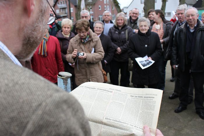 Mit großer Spannung warteten rund 50 Gäste aus Deutschland und den Niederlanden auf die Öffnung der angegrauten Granaturne. In der präparierten Patronenhülse hatte die Kirchenleitung beim Bau des damaligen Gemeindehauses 1951 Erinnerungsstücke, Fotos, Geldscheine und eine Ausgabe des Bocholter-Borkener Volksblatts für die Nachwelt im Grundstein des Hauses verstaut. Nur zufällig war der Grundstein jetzt bei den Abrissarbeiten des ausgedienten Gebäudes entdeckt worden. Umso größer fiel die (Vor-) Freude über den Fund aus.
